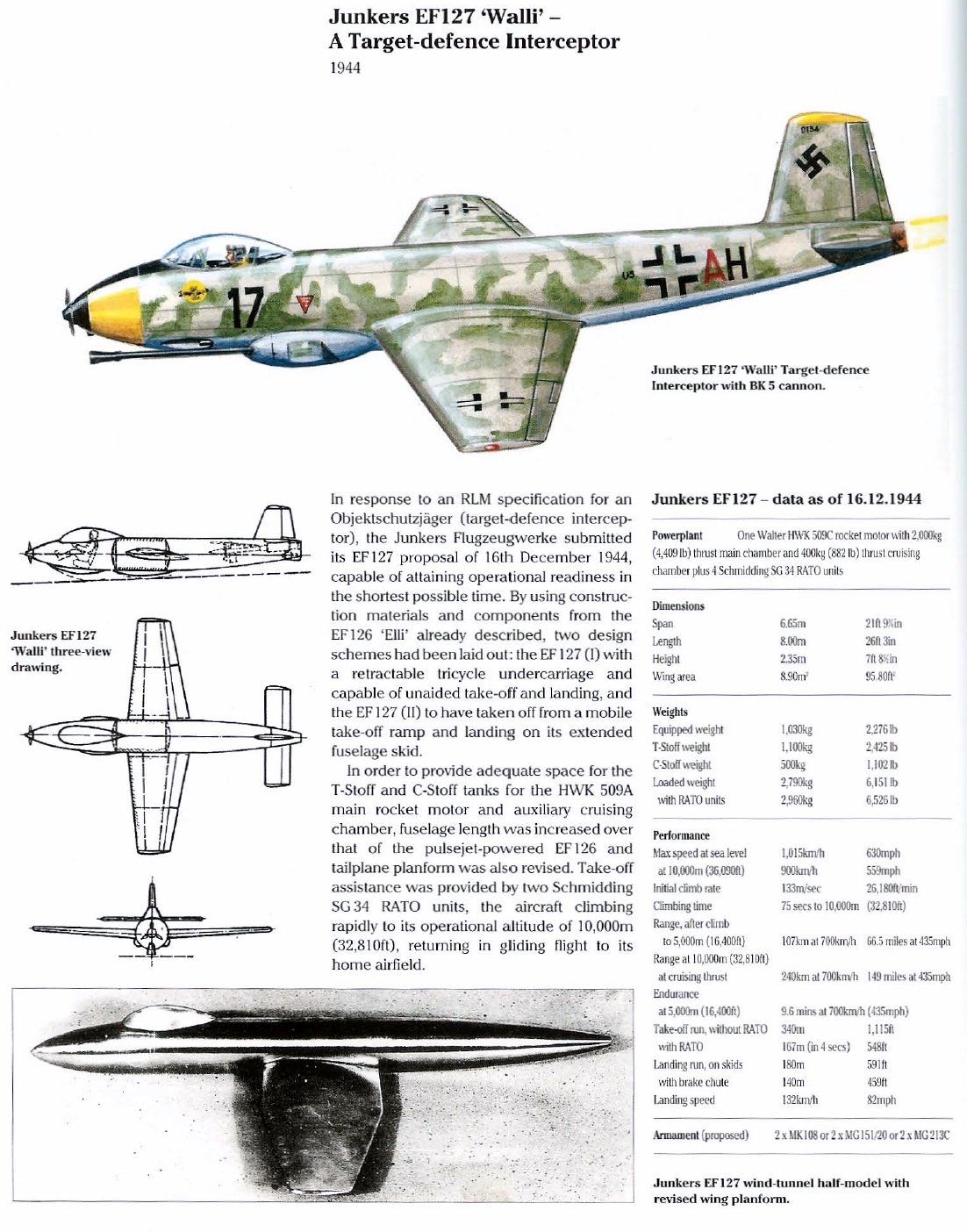 EF 126/127 Wie die Julia eine letzte Hoffnung, schnell und günstig zu einem Objektschutz-Jäger zu kommen. Einfachste Bauweise und ein Raketenantrieb und los von Startrampe! Die 126 wurde, bereits unter russischer Leitung, im Schlepp getestet und stürzte ab, die Pläne verschwanden in Russland.